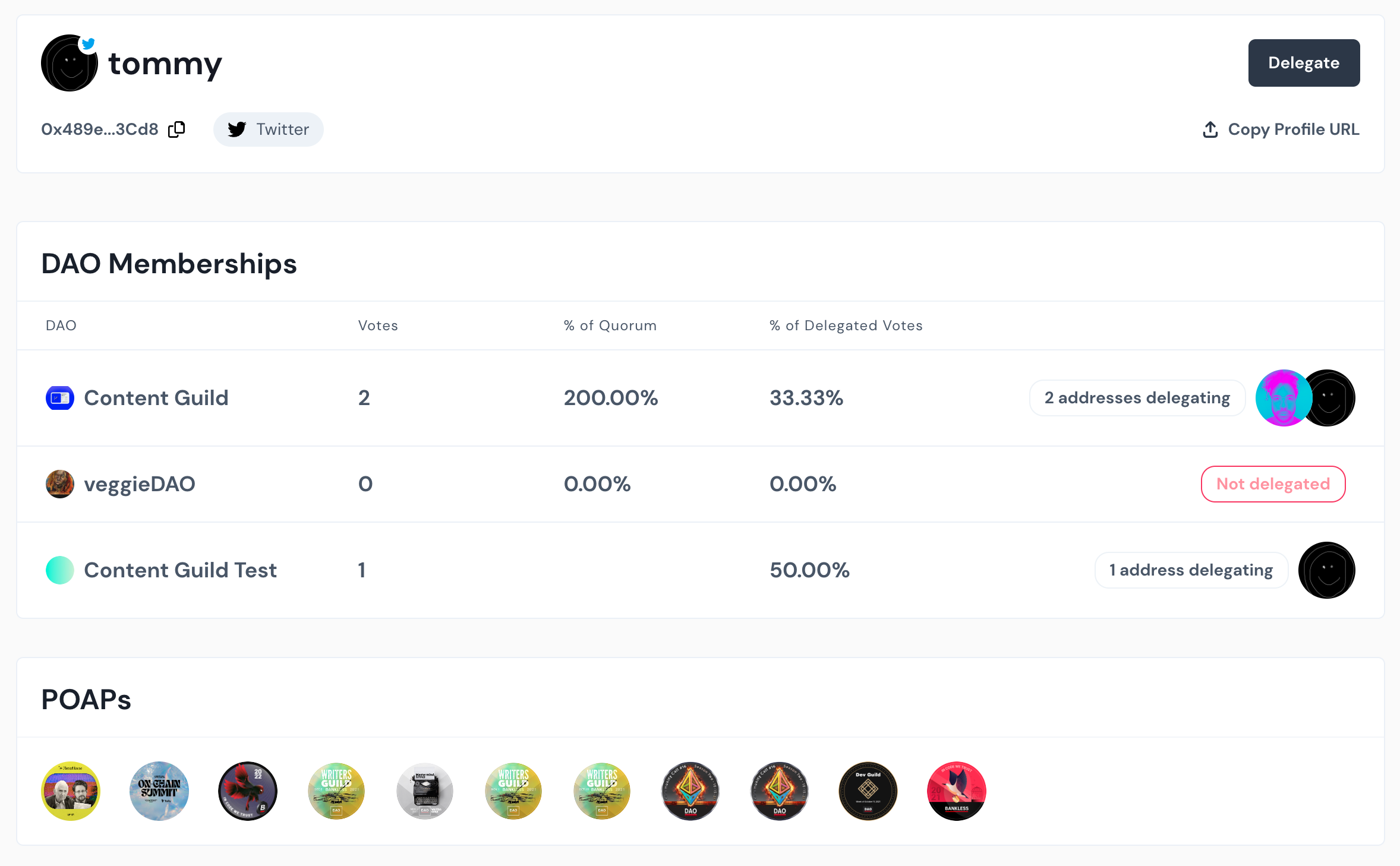 At the top, you'll see a voter's display name, wallet address, and linked Twitter account. You'll also see a Delegate button, which allows you to delegate your voting power to that address.