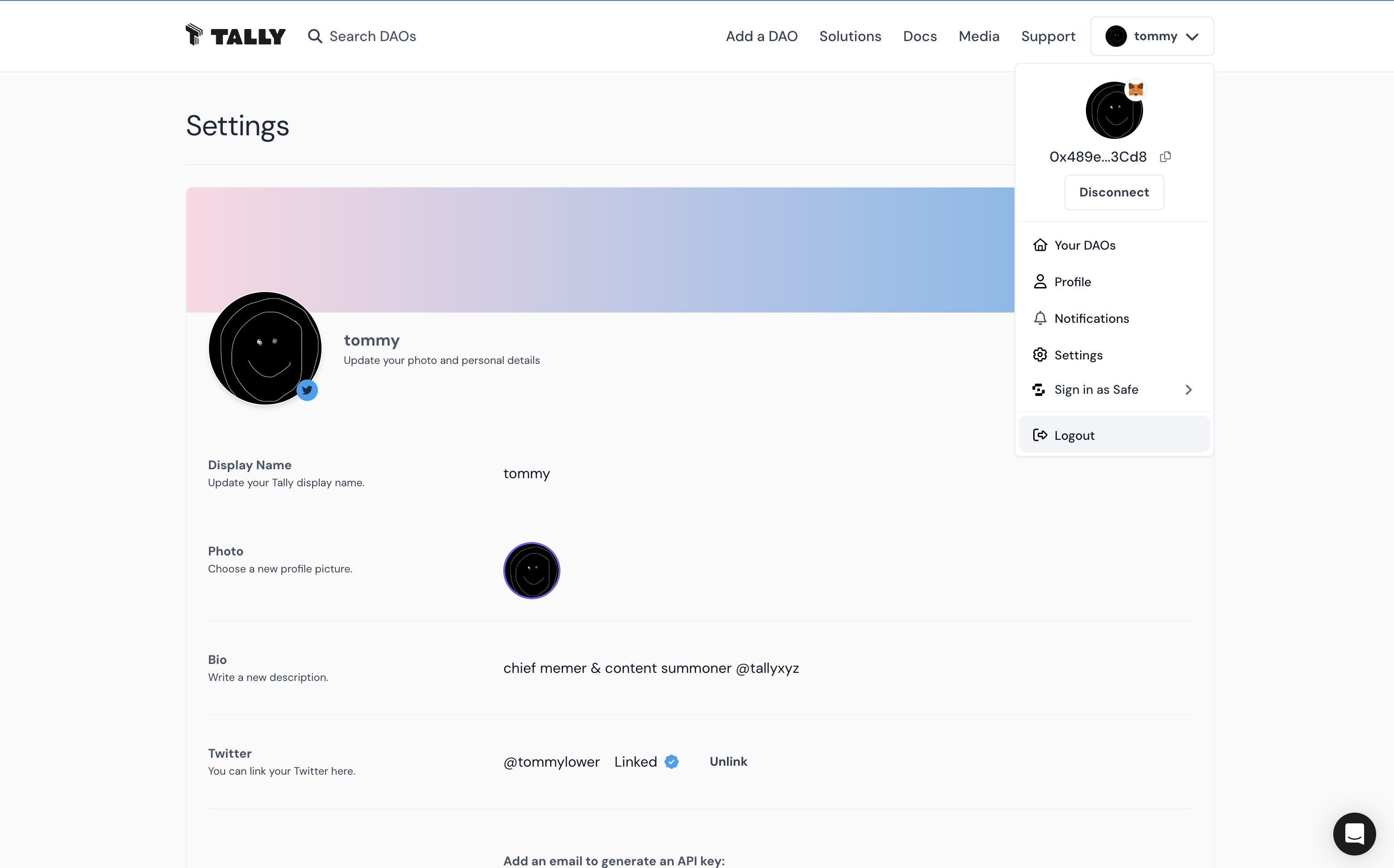 The information you enter in Settings is public to everyone. The data in your Tally Profile is a mix of on-chain data and off-chain data. Editing your Tally Profile adds off-chain data to the on-chain data for your address. In some cases, it overrides the on-chain data (e.g. your Tally name and avatar override your address’s ENS name and avatar, if any).